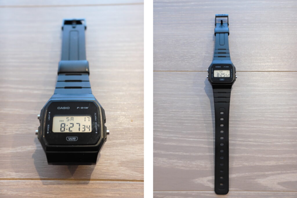 私が使っているのは、文字盤の表示がよりミニマルになったF-91WB(F-91WB-1AJF)です。使い始めて一年半ほどですが、ほぼ毎日これを着けています。